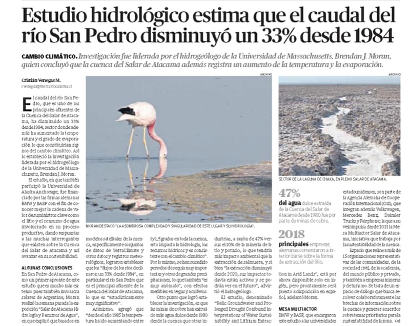 La investigación del experto norteamericano Brendan Morán sobre la hidrología del Salar de Atacama, presentada recientemente ante la Mesa Multiactor, despertó el interés y fue difundida por diversos medios de comunicación.