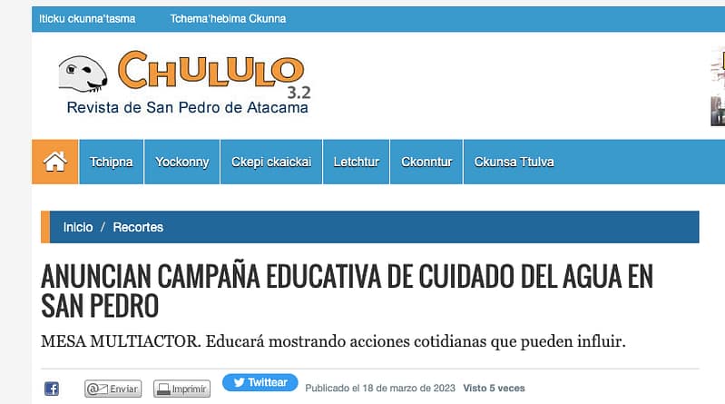 El medio local de San Pedro de Atacama dio a conocer el proyecto de la Mesa Multiactor en pro de la educación para el cuidado de este vital elemento en la zona.