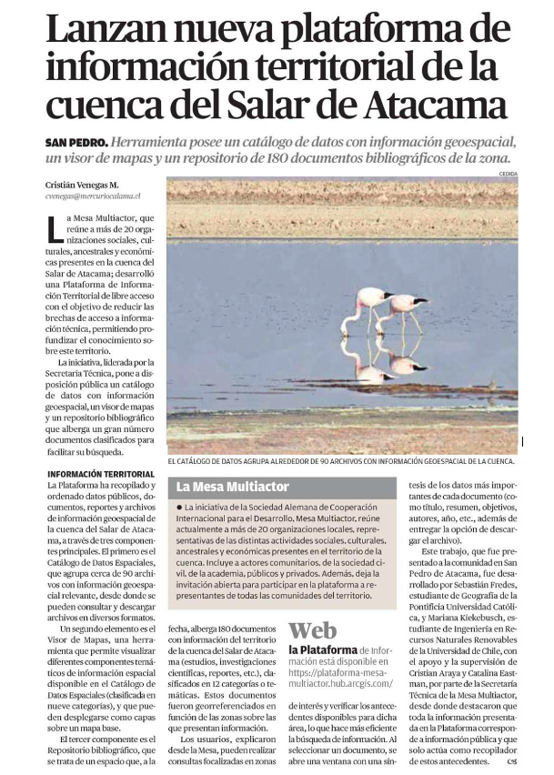 El Mercurio de Calama destaca lanzamiento de Plataforma de información territorial