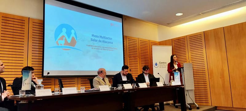 Ante importantes actores nacionales en materia hídrica, María Gabriela Molina expuso la experiencia desarrollada por los participantes de la mesa en pro de la sostenibilidad hídrica de la cuenca del Salar de Atacama, así como la voluntad de colaborar en la Transición Hídrica Justa.