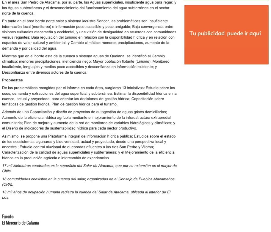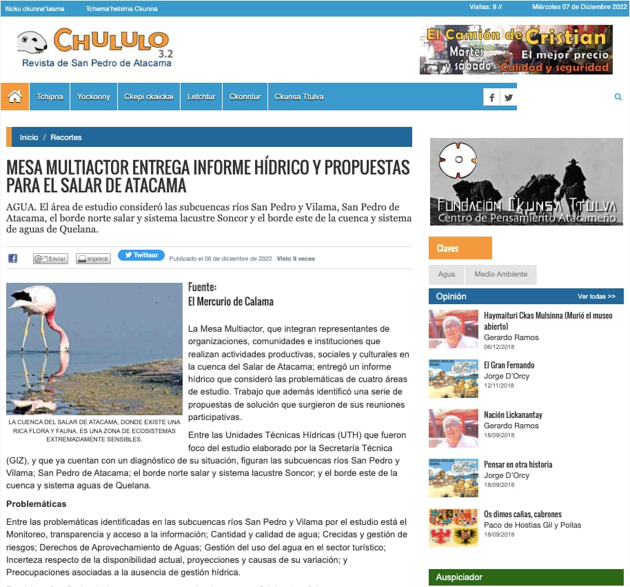 La revista de San Pedro de Atacama destaca la propuesta para mejorar la gestión hídrica de los territorios de las UTH 2,3,4 y 5, recientemente elaborada participativamente por la mesa técnica.