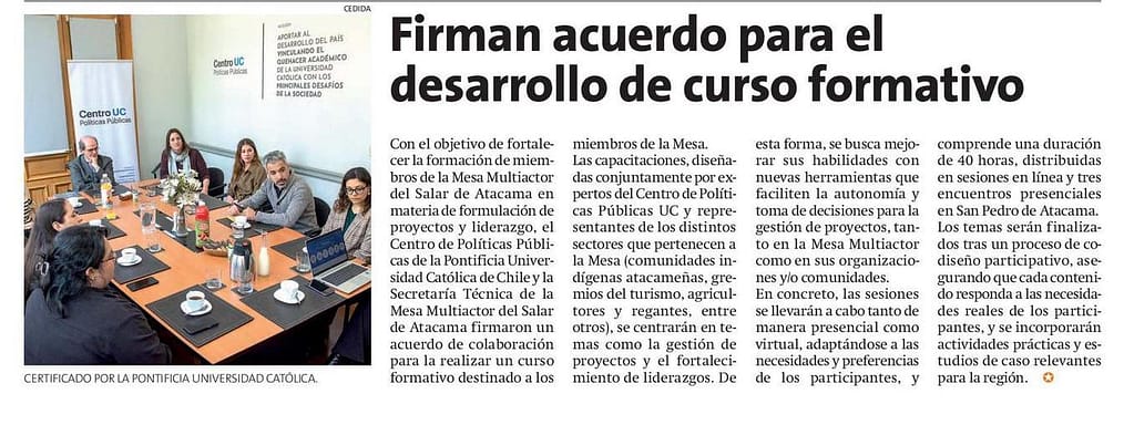 El Centro de Políticas Públicas de la Pontificia Universidad Católica de Chile y la Secretaría Técnica de la Mesa Multiactor del Salar de Atacama, firman acuerdo clave para el fortalecimiento de capacidades locales, con el que se desarrollará un curso formativo para fortalecer las capacidades en la gestión de proyectos y el liderazgo que no solo beneficiará a los miembros la Mesa Multiactor, sino que también a las organizaciones que representan.