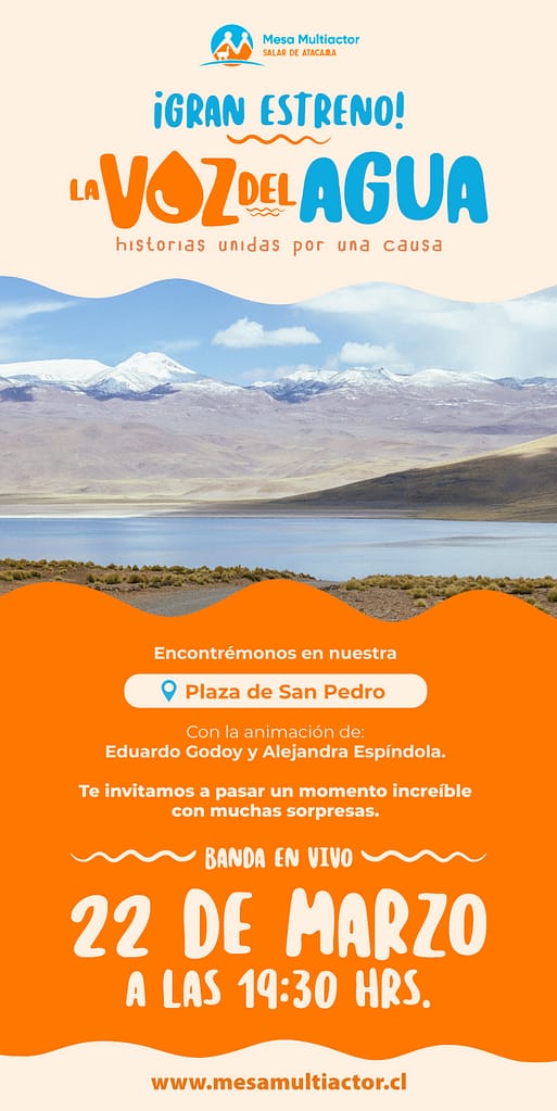 Recogiendo esta identidad y esta urgencia, “La voz del agua: historias unidas por una causa” busca educar mostrando acciones cotidianas que pueden influir en la disponibilidad de este recurso, relevar la importancia del agua en la cuenca del Salar de Atacama, junto a los compromisos y acciones que están realizando los distintos sectores de la zona para educar sobre su uso responsable.