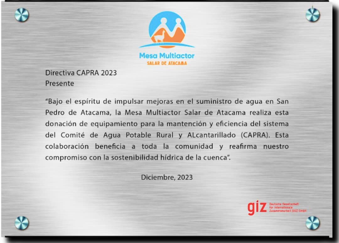 A través de la Agencia Alemana de Cooperación Internacional -GIZ-, la Mesa Multiactor hizo entrega al Comité de Agua Potable Rural y Alcantarillado de San Pedro de Atacama, de una serie de equipos e insumos que ayudarán a mejorar el suministro de agua potable en esta comuna.